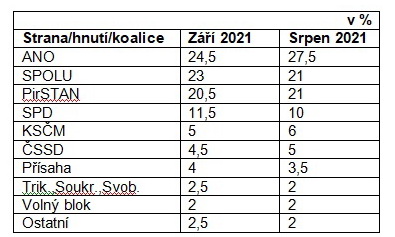 V příloze tohoto krátkého článku uvádím v tabulce přehled volebních preferencí podle agentury Kantar CZ, porovnání září a srpen 2021.