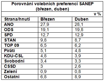 Přestože si vládní strany zjevně nevědí rady s celou řadou problémů země, preference hnutí ANO se v dubnu oproti předchozímu měsíci zvýšily jen o 0,2%. Dosažených 28,1% preferencí je slušným výsledkem, ale hnutí ANO se po vyčerpání rezervoáru hlasů, dnes mimoparlamentních levicových stran, nedaří získávat hlasy těch, kteří volili ve volbách strany pětikoalice.