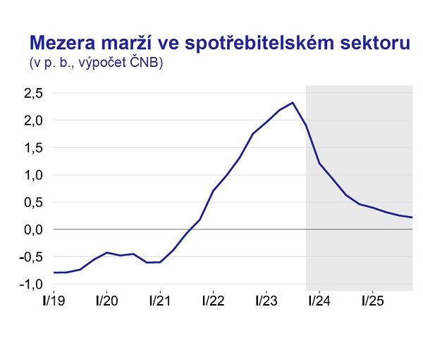 Při pohledu na předkládané grafy mi došlo, že jsme okrádáni hned dvakrát. První způsob spočívá v tom, že firmy se svezly na inflační vlně a přirazily si ještě trochu vlastního hladu v podobě neodůvodnitelně rostoucích ziskových marží. To ukazuje ten graf Mezera marží ve spotřebitelském sektoru.