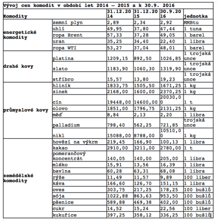 Podívejme se také na oblast komodit, respektive jejich cen. V následující tabulce vidíme vývoj cen komodit, tedy surovin nezbytných pro průmysl, ať již v oblasti strojírenství nebo stavební či potravinářské výroby. Ceny komodit během roku a tři čtvrtě od 31. prosince 2014 k poslednímu dni letošního září vesměs klesají.