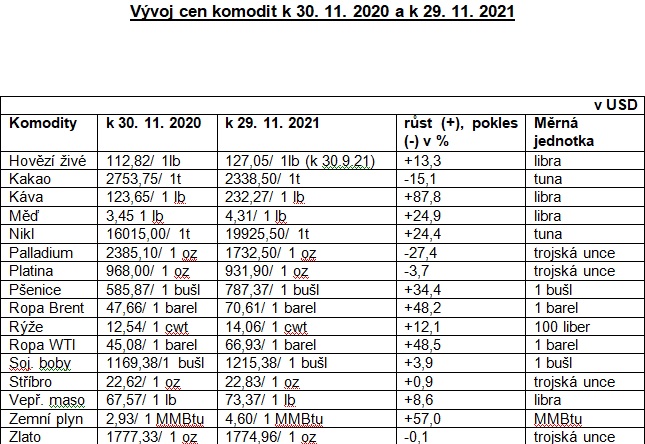 Jak je zřejmé z říjnové tabulky, s výjimkou palladia a zlata, nebyl zaznamenán meziroční pokles cen dalších nejvýznamnějších komodit. Ke konci listopadu dokonce některé komodity zaznamenaly meziroční pokles, např. kakao (o 15,1%), platina ( o 3,7%) a pokračoval meziroční pokles cen palladia (dosáhl již -27,4%).