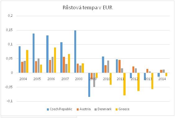 Dobře je to patrné z obrázku sporovnáním HDP Česka, Rakouska a Dánska v EUR od roku 2003. Zpočátku se tento rozdíl prudce snižoval (křivka stoupala), nyní se mírně zvětšuje (křivka klesá). Roku 2008 jsme měli HDP ve směnném kurzu na úrovni 35 procent Dánska a 44 procent Rakouska. Dnes už je to jen 32 procent Dánska a 38 procent Rakouska. Propad Řecka na 90 procent úrovně České republiky se roku 2013 zastavil.
