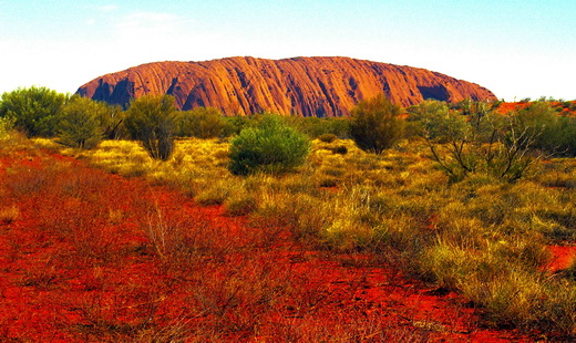 Po deštích se poušť zazelenala dokonce i v okolí ikonické skály Uluru, jak dokládá fotka z mého archivu.