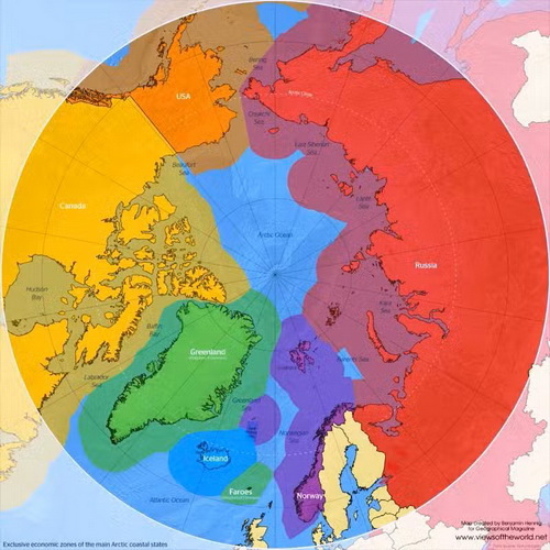 Ohraničenia výlučných ekonomických zón štátov susediacich s Arktídou.
