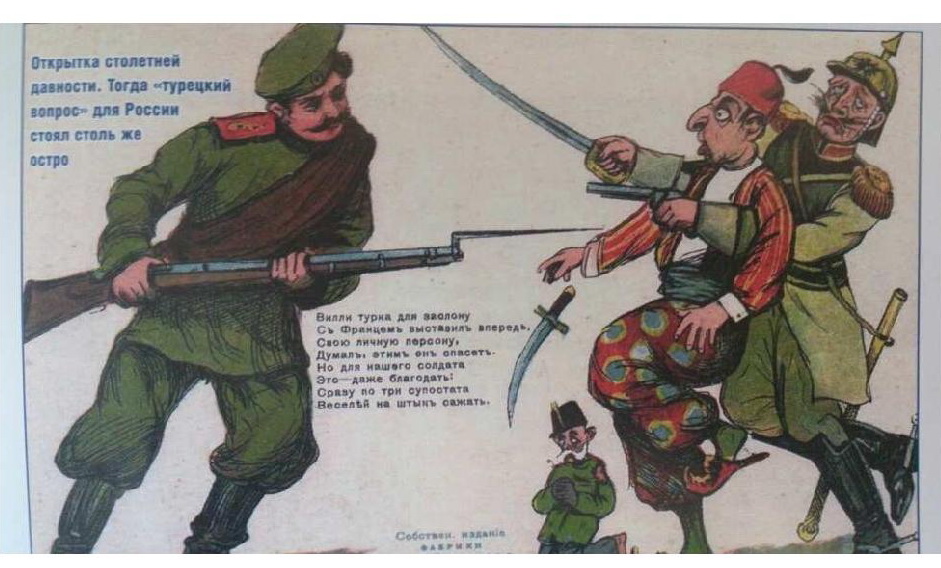 Na obrázku je ruský voják, který se raduje z toho, jak Willi (císařské Německo) s Francem (Rakousko-Uhersko) před sebou nastrkávají proti Rusku Turka, protože v této konstelaci je bude moci probodnout bajonetem všechny tři najednou. To je zhruba také obsah básničky uprostřed obrázku, zatímco současný komentář vlevo nahoře říká, že tenkrát před sto lety byla turecká otázka pro Rusko stejně ostrá jako nyní.