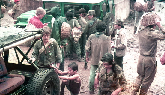 Český hlouček je pod naší vlajkou. Sandinovská černo-rudá se tyčí nad Němci. Vlevo v popředí jsou Řekové a zády k nám v zelené bundě německý profesor Dietrich Heinz, který učil sociologii na univerzitě v Mexiku. Byl jsem jeho spolupracovníkem při ranním dláždění chodníčku z nalezených kamenů v bahně před ubikacemi.