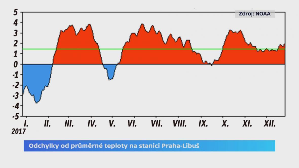 Druhý graf ČT už je z dat Českého hydrometeorologického ústavu. Jsou na něm extrémy ještě názornější. Roční průměr teplot (zelená linie), naměřených v Praze-Libuši, tedy ve stanici ležící více než sto metrů nad pražským centrem, převyšuje o 1,48 stupně Celsia víceletý průměr. Jenže i loňský průměr se skládá z extrémů, mimořádně studeného ledna a výjimečně teplých období předčasného jara, horkého léta a nakonec ještě září, kdy byly teploty tři stupně nad dlouhodobým průměrem.