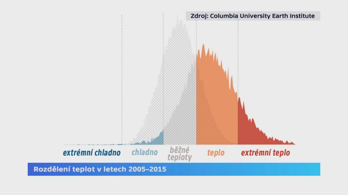 Máme za sebou mírný posun průměrné globální teploty o necelý jeden stupeň Cesia, ale s touto zdánlivě nepatrnu změnou je spojen fakt, že ubývá dnů s teplotami, které jsme vnímali jako běžné a hrneme se do období zcela extrémních teplot. Na opačném konci zároveň zůstávají dny extrémního chladu, jaký teď prožívá severní Amerika. Klima je prostě rozhozené. Graf, na který upozornila Česká televize, vznikl v newyorském ústavu Columbia University Earth Institute, vedeném prof. Janem Švejnarem.