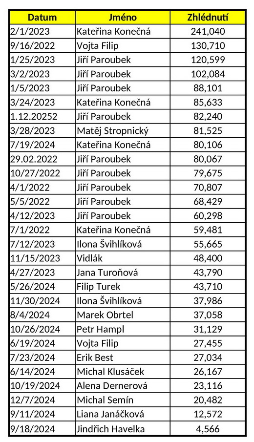 Data pořadů a počet shlédnutí jednotlivých diskutérů v TV J. Bobošíkové