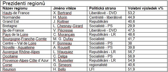 Ve volbách, jak je zřejmé z přehledu v příloze, byli nejúspěšnější Republikáni (LR), kteří získali v regionech 4 prezidentství a s nimi spojení liberální politici další tři prezidentství. Zejména republikány podporovaný X. Bertrand, se svou liberální formací DVD, získal 53,2% hlasů. O tomto muži se ve Francii hovoří jako o horkém kandidátovi Republikánů na francouzského prezidenta.
